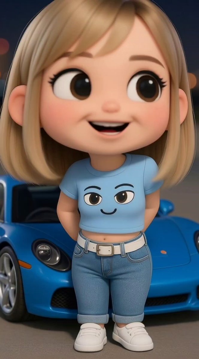 A structured prompt for generating a high-definition 3D chibi character (female, blonde bob, expressive eyes) in a modern outfit (crop top with smiley face, high-waisted jeans), posed next to a vibrant blue sports car at dusk, rendered in a Pixar/mobile game animation style with cinematic lighting and bokeh city lights.