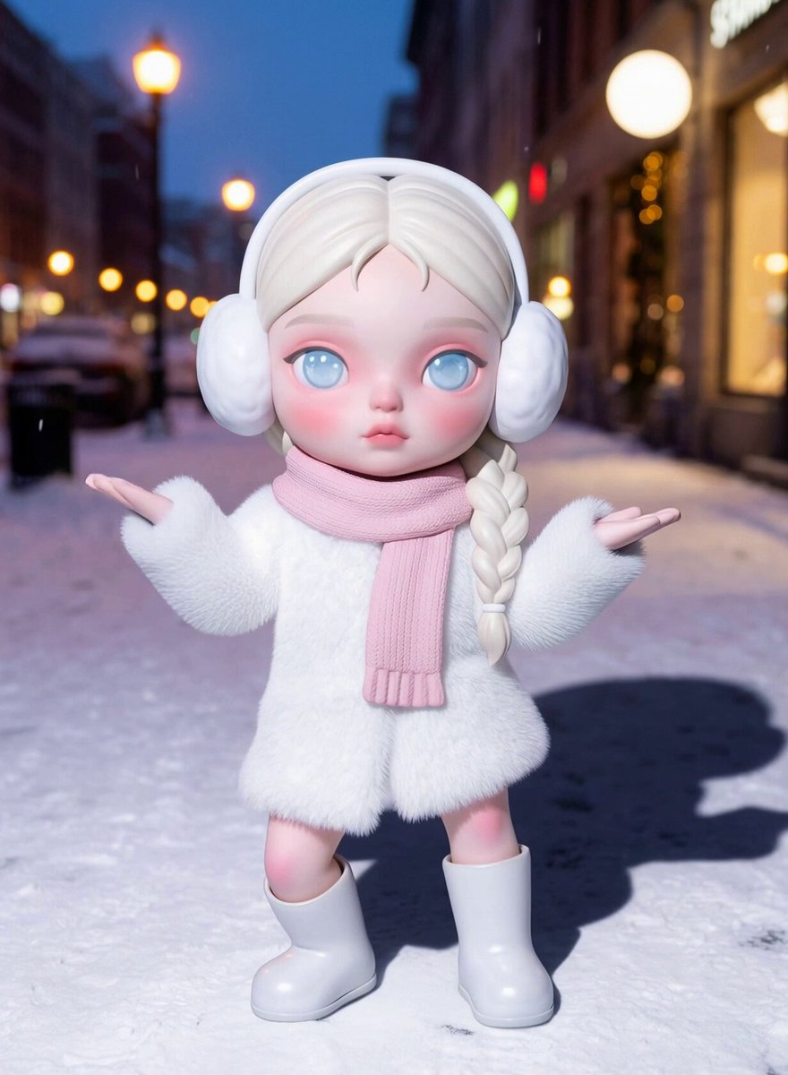 A prompt for generating a 3D stylized, doll-like character (chibi vibe) of a young woman in a snowy city setting. It specifies the character's features (large head, icy blue eyes, platinum blonde braided hair), attire (fluffy white faux-fur coat, pink scarf, earmuffs), environment (twilight, blurred streetlights), and art style (3D render, smooth vinyl texture, direct flash photography).
