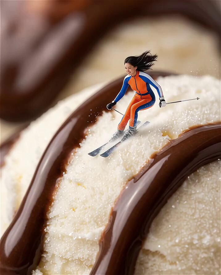 A creative, highly specific macro photography prompt for generating a surreal food scene. It requires using an uploaded face as a reference for an object (implied miniature figure) skiing down a scoop of vanilla ice cream. The scene includes special effects like ice crystal powder snow and giant chocolate sauce rivers, emphasizing ultra-fine details and vibrant contrast under studio food photography lighting.