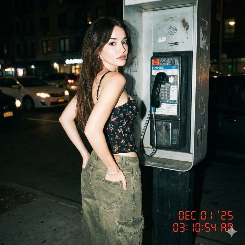 Nighttime flash photo with Y2K aesthetic, red digital...