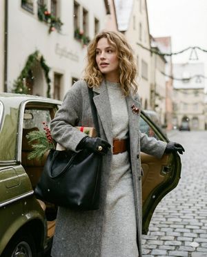 A cinematic prompt for generating an analog film-style image of a woman stepping out of an old car during a light snowfall. The prompt details her elegant, minimalist winter outfit (gray knit dress, herringbone coat, leather belt) and accessories, emphasizing textures, soft natural lighting, and a nostalgic European city atmosphere.