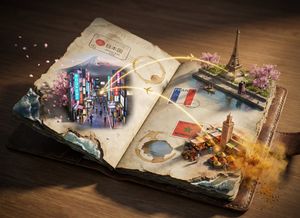 A prompt designed to generate an epic 3D scene where a weathered passport opens up, and its visa stamps transform into miniature, detailed destinations. This prompt uses specific city and detail placeholders to create a living archive of adventures with cinematic lighting and a tilt-shift effect.