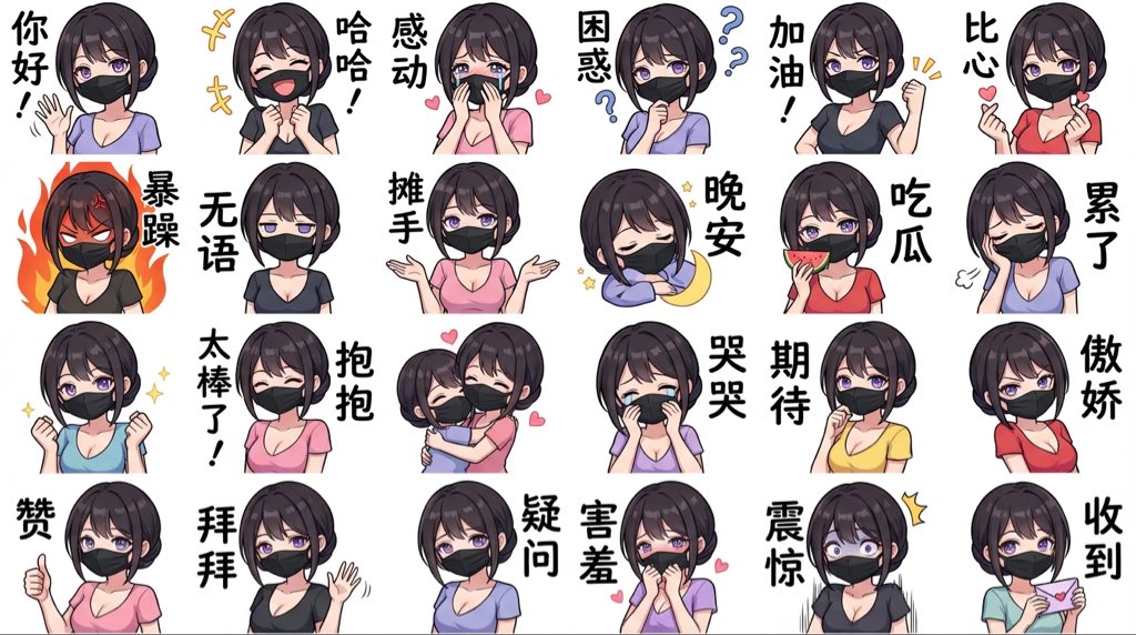 为我生成图中角色的绘制 Q 版的,LINE 风格的半身像表情包,注意头饰要正确 彩色手绘风格,使用 4x6...