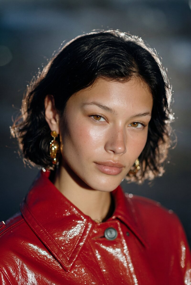 “A hyper-realistic fashion portrait of a beautiful young woman with a short, wavy dark bob haircut. She has glowing, dewy skin ("glass skin") and hazel-brown eyes looking directly at the camera. She is wearing a glossy bright red patent leather jacket with a collar and large, ornate gold statement earrings. The lighting is cinematic with strong backlighting (rim light) creating a glowing halo effect on her hair, while her face is softly illuminated. The background is a dark, blurred bokeh (possibly a city street at night). Shot on 35mm film, f/1.8 aperture, shallow depth of field, high texture, fashion editorial style, raw photo.”